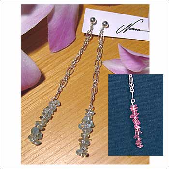 Delicate chips of genuine aquamarine or deep pink tourmaline are suspended by a double-length of sterling chain. Sterling silver posts and butterfly backs. In stock, ships within 2-3 days.