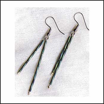 Two bars of matte green glass twist bugle beads are suspended from a surgical steel French wire earring. In stocks ships in 1-3 days.