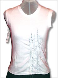 White muscle tee with lace inset sides and pink rhinestones $35