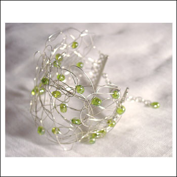 iridescent peridot-hued glass drop beads trapped within design. Sterling