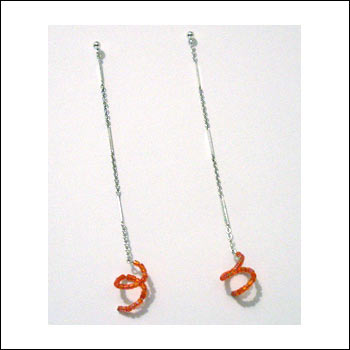 A long strand of delicate sterling silver fancy chain hangs from sterling ball/post earrings. Ends are finished with a tiny spiral of sparkly orange glass seed beads. Sterling silver posts and butterfly back. In stock ships in 1-3 days.