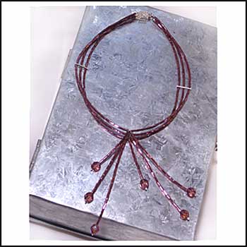3-strand choker necklace of purple glass bugle beads. Center front has cascade of strands, each tipped with an amethyst-hued crystal faceted bead. Sterling silver filigree clasp at back. In stock ships in 1-3 days
