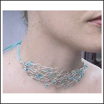 Freeform band choker of sterling silver wire. Sprinkled with aqua colored glass drop beads. Ties at back with narrow ultrasuede bands tipped with aqua glass beads.In stock ships in 1-3 days.