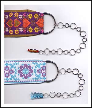 patterned ribbon belt. Attaches at front with hook/chain closure to