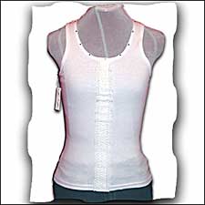 100% cotton rib boy-style tank with binding at neck and armholes.Crystal rhinestones around neckline. Stripe of Cotton Lace at front. Small/Med or Med/Large (ships in 1-2 weeks)